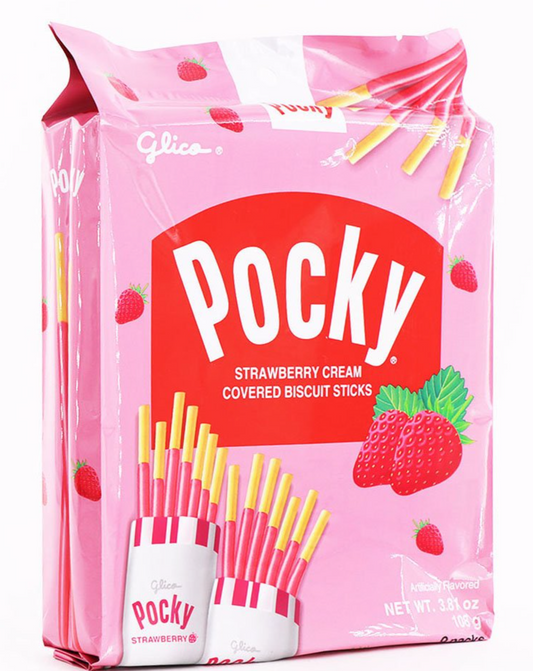 GLICO POCKY STRAWBERRY CREAM COVERED BISCUIT STICKS 3.81oz 9 PACKS A BAG