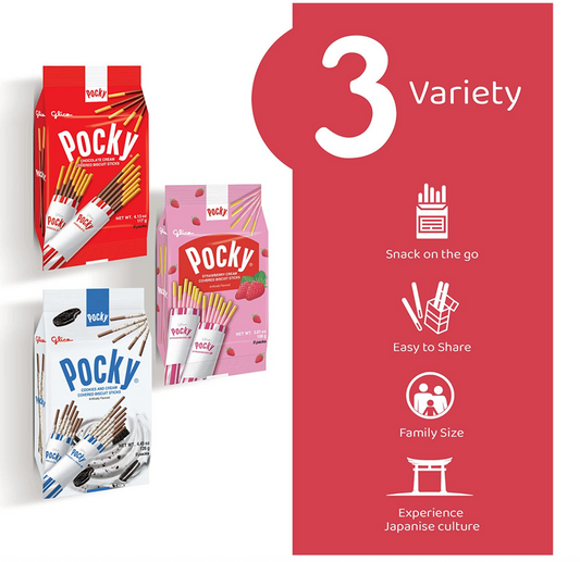 GLICO POCKY Family Three Variety Packs - Strawberry, Chocolate & Cookies Cream