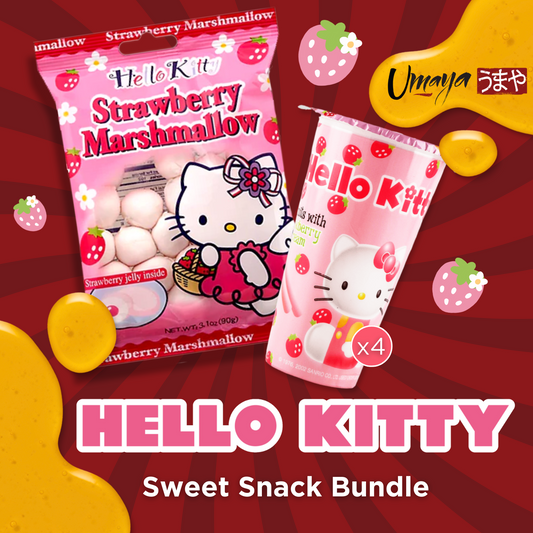 Hello Kitty Snack Bundle - Crispy Biscuit Cookies with Strawberry Cream Frosting Dip (1.16oz/4 Pack) - Strawberry Jelly Filled Marshmallows (3.1oz/1 Pack)