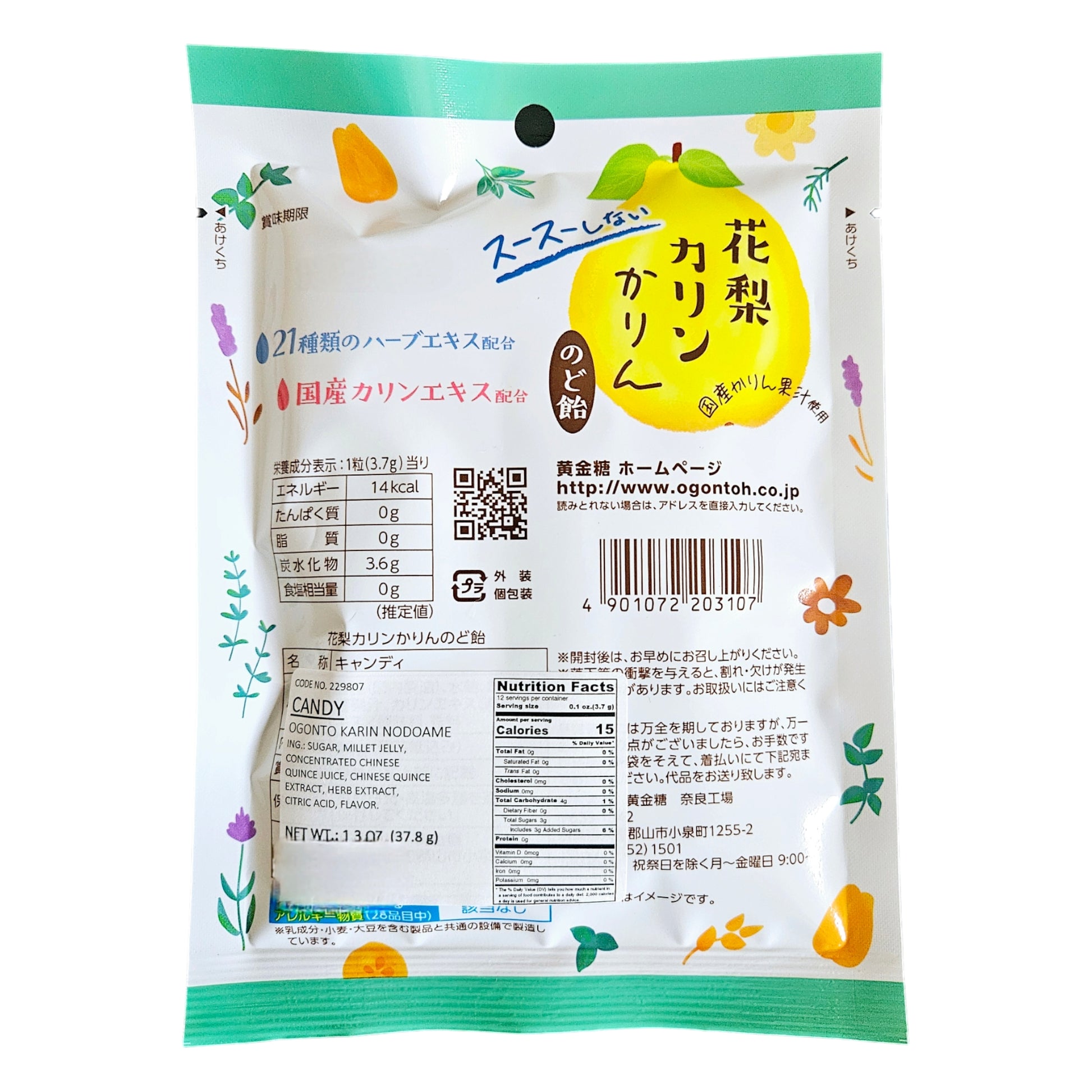 - SWEET & SOOTHING DELIGHT: Indulge your senses in the refreshing taste of Ogontoh Karin (Quince) Nodoame candy! Each piece provides an instant burst of Japanese quince and herbs while soothing your throat. Unwrap a drop, savor the flavor, and let the natural sweetness of these herbal candy lozenges brighten your day.