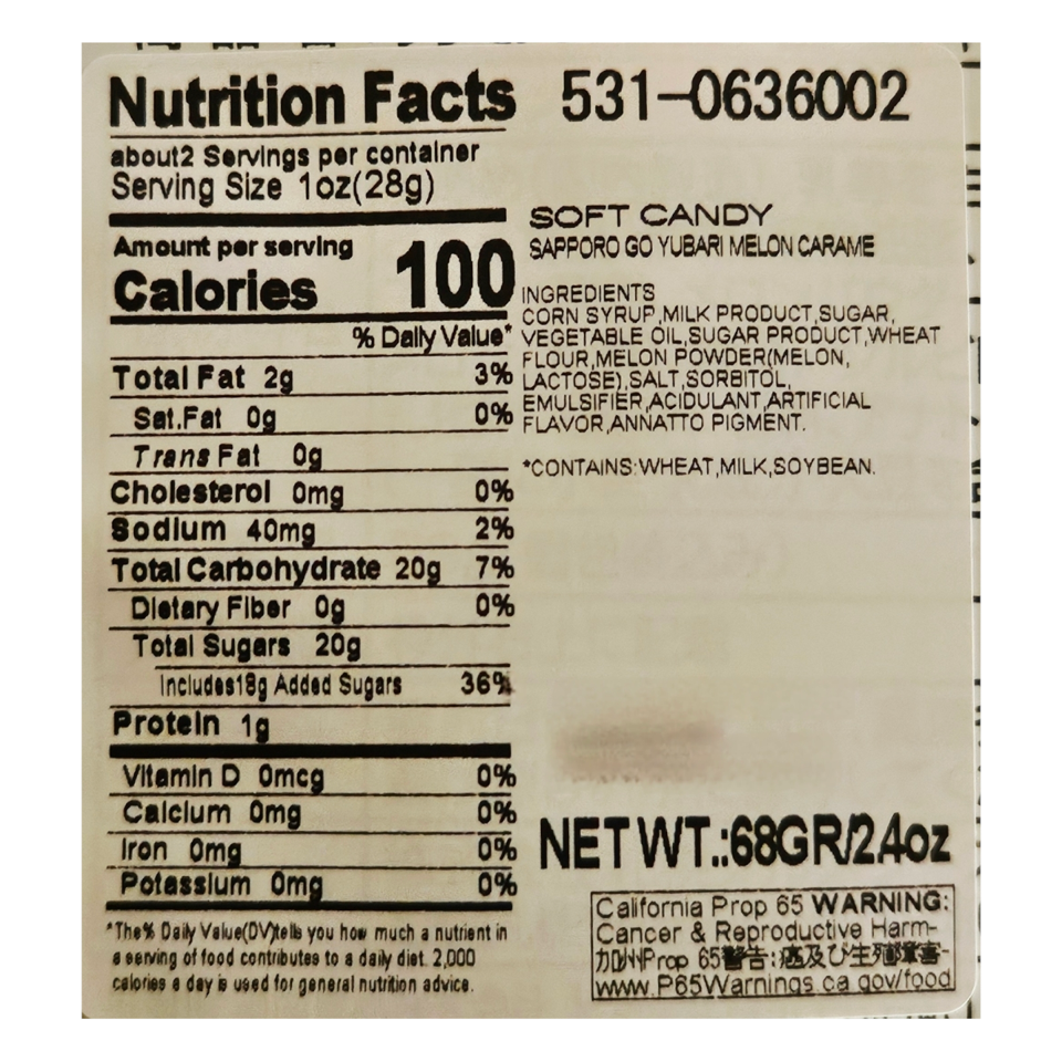 Ingredients: Corn syrup, milk product, sugar, vegetable oil, sugar product, wheat flour, melon powder(melon lactose), salt, sorbitol, emulsifier, acidulant, artificial flavor, annatto pigment.